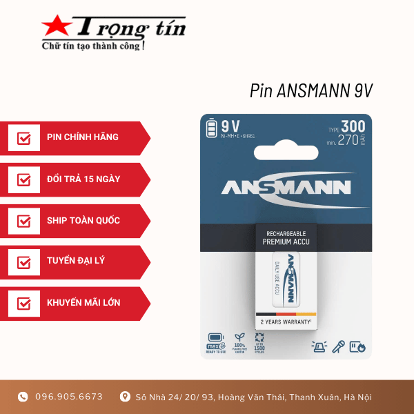 Pin sạc 9v Ansmann được thiết kế chắc chắn, chịu được va đập tốt , độ bền của pin lên đến 1000 lần và được chứng nhận chất lượng của Châu Âu. Cũng như các hãng pin sạc 9v khác, pin chuyên dùng để thay thế cho các pin 9v dùng 1 lần trong các thiết bị micro, thiết bị âm thanh, thiết bị đo và nhiều loại thiết bị đồ chơi khác.